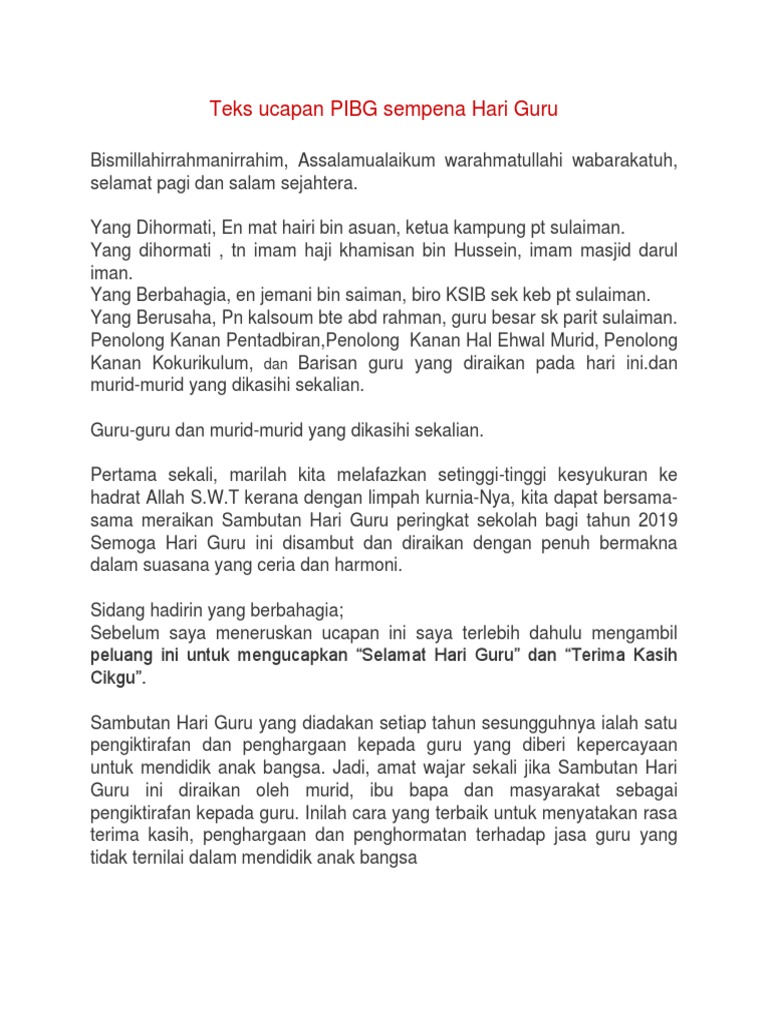 Teks Ucapan Pibg Sempena Hari Guru / Semoga, anak didikan ini tahu betapa.. Ucapan selamat hari guru 2020 daripada ydp pibg sksk. Teks pengacara majlis hari guru. Documents similar to teks ucapan ydp pibg sempena hari guru. Sempena sambutan hari guru tahun ini, guru, obor hemah menyinari pertiwi telah dipilih sebagai tema. Hari ini buat kali kedua saya diberi kepercayaan untuk menjadi pengacara majlis lagi.